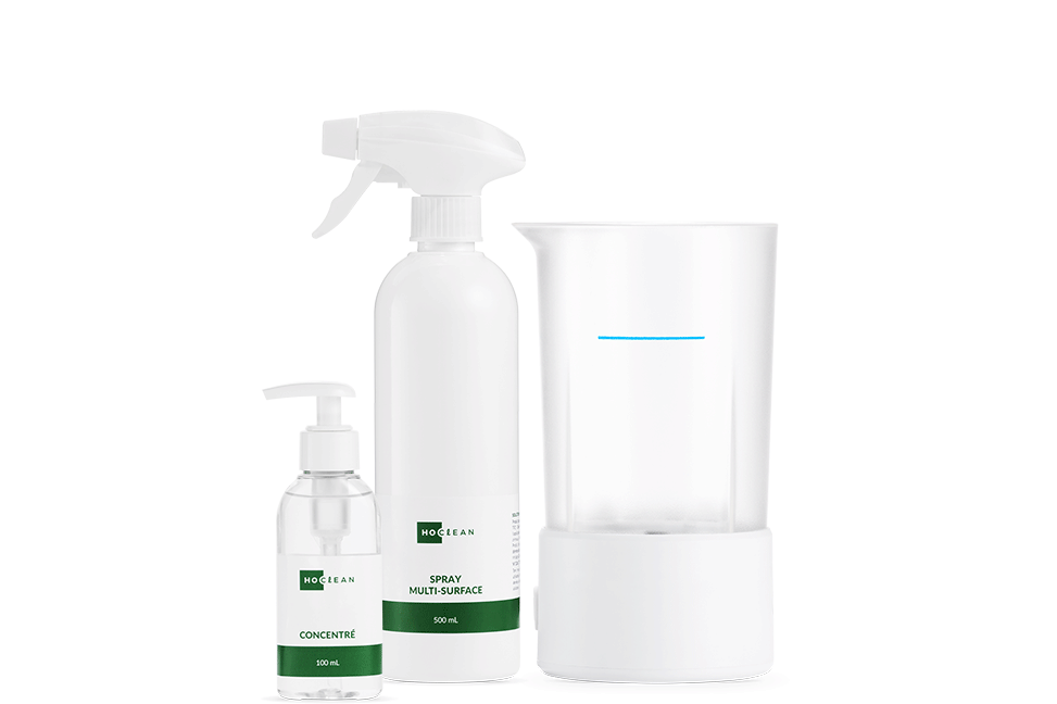 Le Kit HOClean permet de produire sur site une solution désinfectante efficace contre bactéries, virus, champignons et spores. Compact et complet, il inclut l’appareil, un spray, le concentré et un doseur, pour un usage quotidien maîtrisé et écoresponsable.